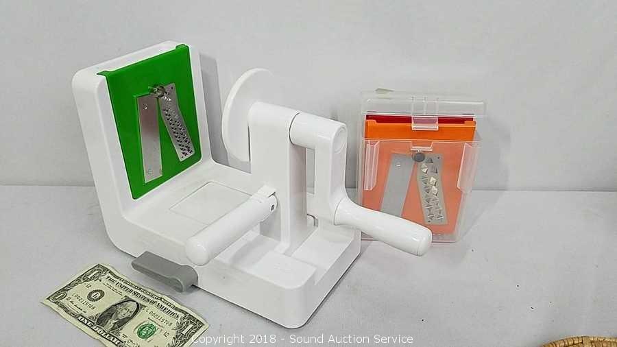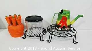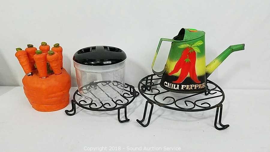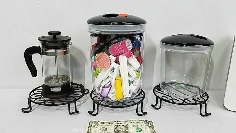 Includes: Air Tight Canister Set, Food Spiralizer, Carrot Spreaders Set, Coffee Press, Woven & Wrought Iron Trivets, and Watering Can. Condition of items sold - The auctioneer shall not be responsible for the correct description, authenticity, genuineness of, estimated selling price of, or defect in any lot, and makes no warranty in connection therewith. No allowance will be made or sale set aside on account of any incorrectness, error in cataloging, or any imperfection not noted. No deduction will be allowed on damaged articles as all goods being exposed for public exhibition are sold “as is” and without recourse. All measurements and sizes - are approximate. Claims - No claims will be allowed after goods are removed from premises. All lots - to be sold AS IS, WHERE IS. ALL SALES FINAL, WE DO NOT ACCEPT RETURNS.