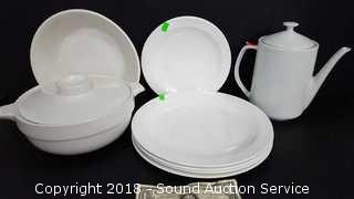 Lot #0117: Stoneware Serving Bowls, Teapot & Corning Plates