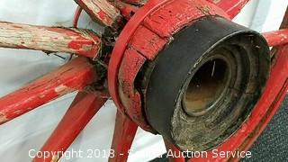 Still has the original steel bearing, steel and wooden hub with a steel tire, wooden spokes and felloes. Has some damage. Would make great yard art! Condition of items sold - The auctioneer shall not be responsible for the correct description, authenticity, genuineness of, estimated selling price of, or defect in any lot, and makes no warranty in connection therewith. No allowance will be made or sale set aside on account of any incorrectness, error in cataloging, or any imperfection not noted. No deduction will be allowed on damaged articles as all goods being exposed for public exhibition are sold “as is” and without recourse. All measurements and sizes - are approximate. Claims - No claims will be allowed after goods are removed from premises. All lots - to be sold AS IS, WHERE IS. ALL SALES FINAL, WE DO NOT ACCEPT RETURNS.