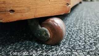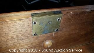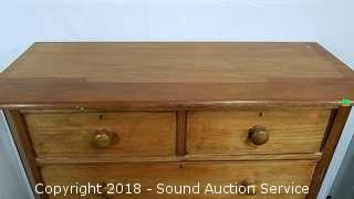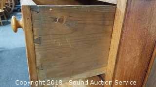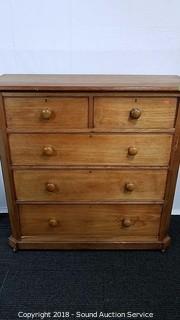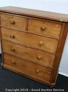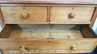 Has skeleton key locks, no key. Porcelain castors. Missing a couple of the drawer pulls. Dovetail construction. Approx. 45" H, 46" W, 18" D. Condition of items sold - The auctioneer shall not be responsible for the correct description, authenticity, genuineness of, estimated selling price of, or defect in any lot, and makes no warranty in connection therewith. No allowance will be made or sale set aside on account of any incorrectness, error in cataloging, or any imperfection not noted. No deduction will be allowed on damaged articles as all goods being exposed for public exhibition are sold “as is” and without recourse. All measurements and sizes - are approximate. Claims - No claims will be allowed after goods are removed from premises. All lots - to be sold AS IS, WHERE IS. ALL SALES FINAL, WE DO NOT ACCEPT RETURNS.