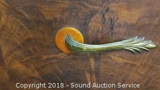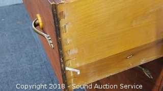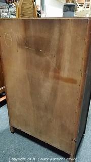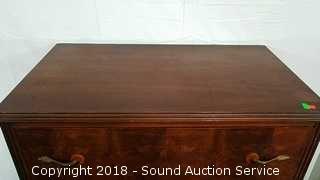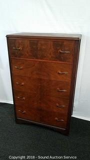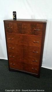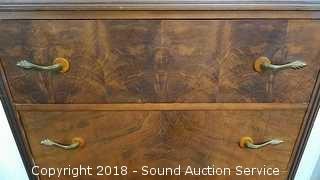 Steel castors, beautiful burl front, dovetail construction, unique bakelite and brass drawer pulls. In excellent condition. Some crazing in the finish on the top. Approx. 50" H, 32" W, 18" D. Condition of items sold - The auctioneer shall not be responsible for the correct description, authenticity, genuineness of, estimated selling price of, or defect in any lot, and makes no warranty in connection therewith. No allowance will be made or sale set aside on account of any incorrectness, error in cataloging, or any imperfection not noted. No deduction will be allowed on damaged articles as all goods being exposed for public exhibition are sold “as is” and without recourse. All measurements and sizes - are approximate. Claims - No claims will be allowed after goods are removed from premises. All lots - to be sold AS IS, WHERE IS. ALL SALES FINAL, WE DO NOT ACCEPT RETURNS.