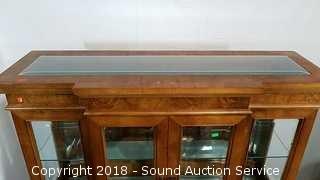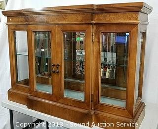 Ornate design with mirrored back, beveled glass top, sides and front. Approx. 29" H, 40" W, 12" D. Condition of items sold - The auctioneer shall not be responsible for the correct description, authenticity, genuineness of, estimated selling price of, or defect in any lot, and makes no warranty in connection therewith. No allowance will be made or sale set aside on account of any incorrectness, error in cataloging, or any imperfection not noted. No deduction will be allowed on damaged articles as all goods being exposed for public exhibition are sold “as is” and without recourse. All measurements and sizes - are approximate. Claims - No claims will be allowed after goods are removed from premises. All lots - to be sold AS IS, WHERE IS. ALL SALES FINAL, WE DO NOT ACCEPT RETURNS.
