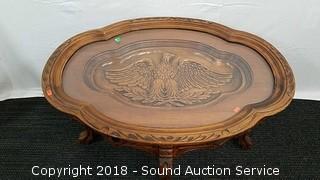 Very ornately crafted, deep embossed carved eagle, has a removable glass top for easy cleaning. Approx. 20" H, 24" x 33-1/2". Condition of items sold - The auctioneer shall not be responsible for the correct description, authenticity, genuineness of, estimated selling price of, or defect in any lot, and makes no warranty in connection therewith. No allowance will be made or sale set aside on account of any incorrectness, error in cataloging, or any imperfection not noted. No deduction will be allowed on damaged articles as all goods being exposed for public exhibition are sold “as is” and without recourse. All measurements and sizes - are approximate. Claims - No claims will be allowed after goods are removed from premises. All lots - to be sold AS IS, WHERE IS. ALL SALES FINAL, WE DO NOT ACCEPT RETURNS.