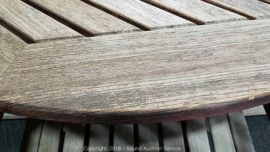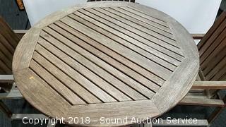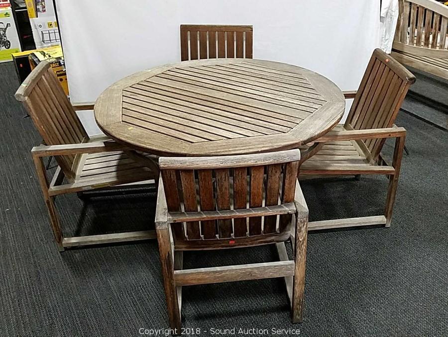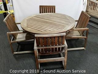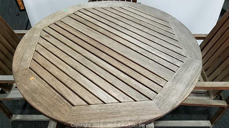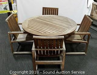 Includes patio table and four chairs. Made in Indonesia. Approx. 29" H, 59" diameter. Condition of items sold - The auctioneer shall not be responsible for the correct description, authenticity, genuineness of, estimated selling price of, or defect in any lot, and makes no warranty in connection therewith. No allowance will be made or sale set aside on account of any incorrectness, error in cataloging, or any imperfection not noted. No deduction will be allowed on damaged articles as all goods being exposed for public exhibition are sold “as is” and without recourse. All measurements and sizes - are approximate. Claims - No claims will be allowed after goods are removed from premises. All lots - to be sold AS IS, WHERE IS. ALL SALES FINAL, WE DO NOT ACCEPT RETURNS.