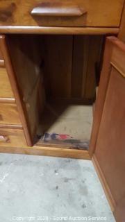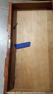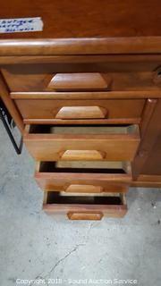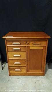 Comes with skeleton key. Has 5 drawers and lower cabinet. Made in Illinois. Approx. 30" H, 28" W, 18" D. Condition of items sold - The auctioneer shall not be responsible for the correct description, authenticity, genuineness of, estimated selling price of, or defect in any lot, and makes no warranty in connection therewith. No allowance will be made or sale set aside on account of any incorrectness, error in cataloging, or any imperfection not noted. No deduction will be allowed on damaged articles as all goods being exposed for public exhibition are sold “as is” and without recourse. All measurements and sizes - are approximate. Claims - No claims will be allowed after goods are removed from premises. All lots - to be sold AS IS, WHERE IS. ALL SALES FINAL, WE DO NOT ACCEPT RETURNS.
