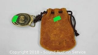Belt buckle is brass, BX-0334, Benjamin Franklin Registered Collection, comes with a leather pouch. Wristwatch is a Britania, Japanese movement, leather wrist band, looks to be made from a 1968 Kennedy half dollar. Condition of items sold - The auctioneer shall not be responsible for the correct description, authenticity, genuineness of, estimated selling price of, or defect in any lot, and makes no warranty in connection therewith. No allowance will be made or sale set aside on account of any incorrectness, error in cataloging, or any imperfection not noted. No deduction will be allowed on damaged articles as all goods being exposed for public exhibition are sold “as is” and without recourse. All measurements and sizes - are approximate. Claims - No claims will be allowed after goods are removed from premises. All lots - to be sold AS IS, WHERE IS. ALL SALES FINAL, WE DO NOT ACCEPT RETURNS.
