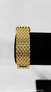 Swiss diamond quartz movement. 6" long band. Condition of items sold - The auctioneer shall not be responsible for the correct description, authenticity, genuineness of, estimated selling price of, or defect in any lot, and makes no warranty in connection therewith. No allowance will be made or sale set aside on account of any incorrectness, error in cataloging, or any imperfection not noted. No deduction will be allowed on damaged articles as all goods being exposed for public exhibition are sold “as is” and without recourse. All measurements and sizes - are approximate. Claims - No claims will be allowed after goods are removed from premises. All lots - to be sold AS IS, WHERE IS. ALL SALES FINAL, WE DO NOT ACCEPT RETURNS.