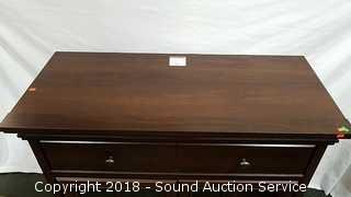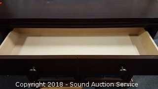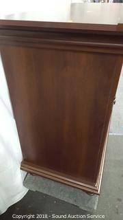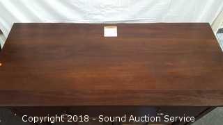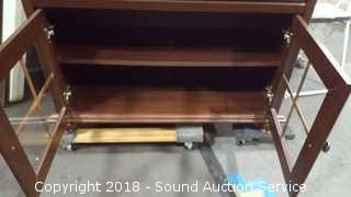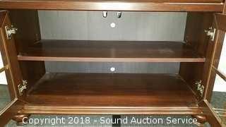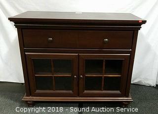 Has single drawer and lower glass door cabinet. Approx. 36" H, 44" W, 19-1/2" D. Condition of items sold - The auctioneer shall not be responsible for the correct description, authenticity, genuineness of, estimated selling price of, or defect in any lot, and makes no warranty in connection therewith. No allowance will be made or sale set aside on account of any incorrectness, error in cataloging, or any imperfection not noted. No deduction will be allowed on damaged articles as all goods being exposed for public exhibition are sold “as is” and without recourse. All measurements and sizes - are approximate. Claims - No claims will be allowed after goods are removed from premises. All lots - to be sold AS IS, WHERE IS. ALL SALES FINAL, WE DO NOT ACCEPT RETURNS.