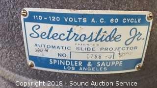 Select-o-slide Jr, by Spindler & Sauppe, automatic, comes with power cord. Comes with a Brumberger slide viewer. Condition of items sold - The auctioneer shall not be responsible for the correct description, authenticity, genuineness of, estimated selling price of, or defect in any lot, and makes no warranty in connection therewith. No allowance will be made or sale set aside on account of any incorrectness, error in cataloging, or any imperfection not noted. No deduction will be allowed on damaged articles as all goods being exposed for public exhibition are sold “as is” and without recourse. All measurements and sizes - are approximate. Claims - No claims will be allowed after goods are removed from premises. All lots - to be sold AS IS, WHERE IS. ALL SALES FINAL, WE DO NOT ACCEPT RETURNS.