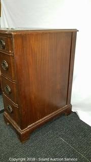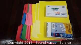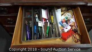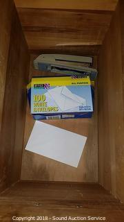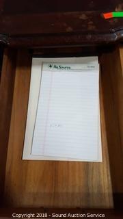 Has some scratchng and discoloration. Approx. 30" H, 41" W, 21" D. Comes with some office supplies: envelopes, stapler, pens, letter and number stickers, file folders, index cards, and more. Condition of items sold - The auctioneer shall not be responsible for the correct description, authenticity, genuineness of, estimated selling price of, or defect in any lot, and makes no warranty in connection therewith. No allowance will be made or sale set aside on account of any incorrectness, error in cataloging, or any imperfection not noted. No deduction will be allowed on damaged articles as all goods being exposed for public exhibition are sold “as is” and without recourse. All measurements and sizes - are approximate. Claims - No claims will be allowed after goods are removed from premises. All lots - to be sold AS IS, WHERE IS. ALL SALES FINAL, WE DO NOT ACCEPT RETURNS.