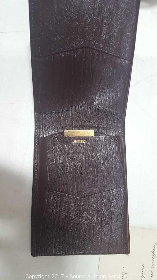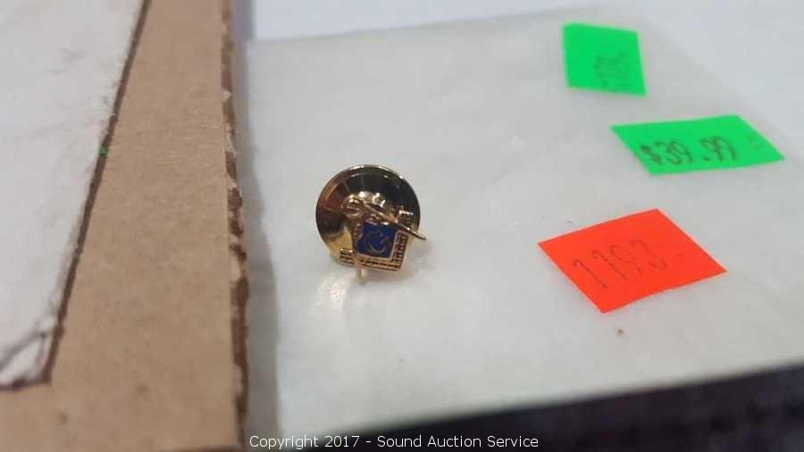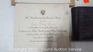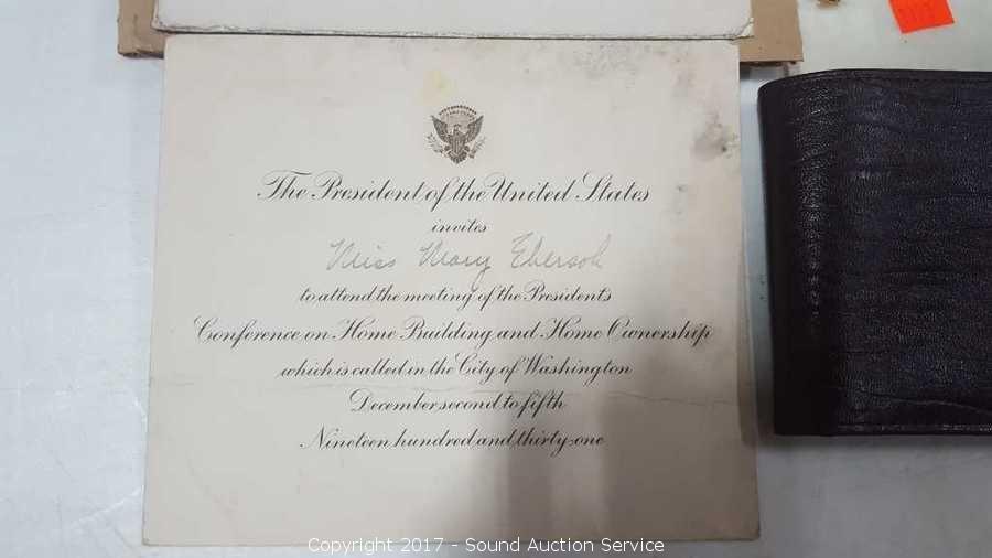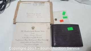 Includes: 14k Yellow Gold Masonic Compass & Square Lapel Pin, 3/8" TW: 1.8g, Amity buffalo skin wallet and 1931 Presidential White House Invitation with Stamped Envelope.