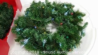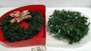 One of the wreaths is pre-lit. Condition of items sold - The auctioneer shall not be responsible for the correct description, authenticity, genuineness of, estimated selling price of, or defect in any lot, and makes no warranty in connection therewith. No allowance will be made or sale set aside on account of any incorrectness, error in cataloging, or any imperfection not noted. No deduction will be allowed on damaged articles as all goods being exposed for public exhibition are sold “as is” and without recourse. All measurements and sizes - are approximate. Claims - No claims will be allowed after goods are removed from premises. All lots - to be sold AS IS, WHERE IS. ALL SALES FINAL, WE DO NOT ACCEPT RETURNS.