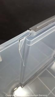 One of the totes is missing a latch, other than that all seem to be intact. Approx. 10-1/2" x 14-1/2" x 21". Condition of items sold - The auctioneer shall not be responsible for the correct description, authenticity, genuineness of, estimated selling price of, or defect in any lot, and makes no warranty in connection therewith. No allowance will be made or sale set aside on account of any incorrectness, error in cataloging, or any imperfection not noted. No deduction will be allowed on damaged articles as all goods being exposed for public exhibition are sold “as is” and without recourse. All measurements and sizes - are approximate. Claims - No claims will be allowed after goods are removed from premises. All lots - to be sold AS IS, WHERE IS. ALL SALES FINAL, WE DO NOT ACCEPT RETURNS.