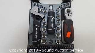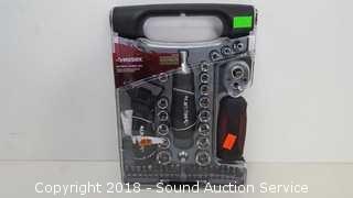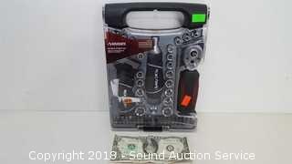 Set contains 22 sockets, 20 bits, 1 adapter, and 3 tools, Chrome finish easily wipes clean of oil and dirt. One of the stubbu sockets doesn't match. Condition of items sold - The auctioneer shall not be responsible for the correct description, authenticity, genuineness of, estimated selling price of, or defect in any lot, and makes no warranty in connection therewith. No allowance will be made or sale set aside on account of any incorrectness, error in cataloging, or any imperfection not noted. No deduction will be allowed on damaged articles as all goods being exposed for public exhibition are sold “as is” and without recourse. All measurements and sizes - are approximate. Claims - No claims will be allowed after goods are removed from premises. All lots - to be sold AS IS, WHERE IS. ALL SALES FINAL, WE DO NOT ACCEPT RETURNS.