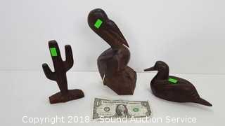 Cactus, pelican and a duck. Approx. 4" to 9" H. Condition of items sold - The auctioneer shall not be responsible for the correct description, authenticity, genuineness of, estimated selling price of, or defect in any lot, and makes no warranty in connection therewith. No allowance will be made or sale set aside on account of any incorrectness, error in cataloging, or any imperfection not noted. No deduction will be allowed on damaged articles as all goods being exposed for public exhibition are sold “as is” and without recourse. All measurements and sizes - are approximate. Claims - No claims will be allowed after goods are removed from premises. All lots - to be sold AS IS, WHERE IS. ALL SALES FINAL, WE DO NOT ACCEPT RETURNS.