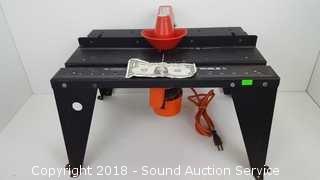 Comes with a Black & Decker 3/4HP Router. Condition of items sold - The auctioneer shall not be responsible for the correct description, authenticity, genuineness of, estimated selling price of, or defect in any lot, and makes no warranty in connection therewith. No allowance will be made or sale set aside on account of any incorrectness, error in cataloging, or any imperfection not noted. No deduction will be allowed on damaged articles as all goods being exposed for public exhibition are sold “as is” and without recourse. All measurements and sizes - are approximate. Claims - No claims will be allowed after goods are removed from premises. All lots - to be sold AS IS, WHERE IS. ALL SALES FINAL, WE DO NOT ACCEPT RETURNS.
