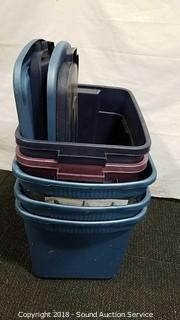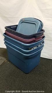 2 Are Rubbermaid, 3 Are Sterilite, Both Rubbermaids Have Lids. Condition of items sold - The auctioneer shall not be responsible for the correct description, authenticity, genuineness of, estimated selling price of, or defect in any lot, and makes no warranty in connection therewith. No allowance will be made or sale set aside on account of any incorrectness, error in cataloging, or any imperfection not noted. No deduction will be allowed on damaged articles as all goods being exposed for public exhibition are sold “as is” and without recourse. All measurements and sizes - are approximate. Claims - No claims will be allowed after goods are removed from premises. All lots - to be sold AS IS, WHERE IS. ALL SALES FINAL, WE DO NOT ACCEPT RETURNS.