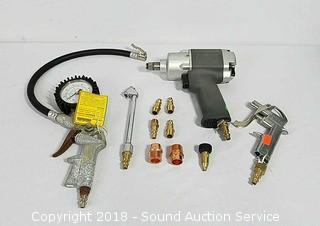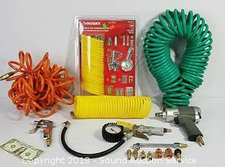 Includes: 1/2" Drive Impact Wrench, Tire Inflator with Gauge, Air Detail Nozzle, Hoses & Fittings. Condition of items sold - The auctioneer shall not be responsible for the correct description, authenticity, genuineness of, estimated selling price of, or defect in any lot, and makes no warranty in connection therewith. No allowance will be made or sale set aside on account of any incorrectness, error in cataloging, or any imperfection not noted. No deduction will be allowed on damaged articles as all goods being exposed for public exhibition are sold “as is” and without recourse. All measurements and sizes - are approximate. Claims - No claims will be allowed after goods are removed from premises. All lots - to be sold AS IS, WHERE IS. ALL SALES FINAL, WE DO NOT ACCEPT RETURNS.