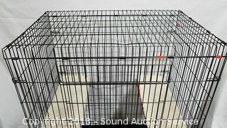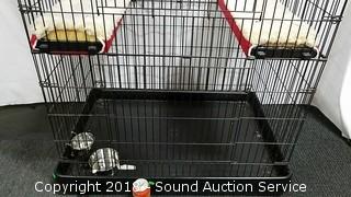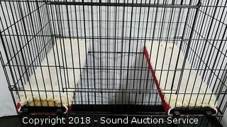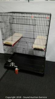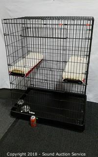 Looks to be set up for felines with pet dishes and 2 perching shelves. 2 Door openings and wheels. Approx. 46" x 34" x 23". Condition of items sold - The auctioneer shall not be responsible for the correct description, authenticity, genuineness of, estimated selling price of, or defect in any lot, and makes no warranty in connection therewith. No allowance will be made or sale set aside on account of any incorrectness, error in cataloging, or any imperfection not noted. No deduction will be allowed on damaged articles as all goods being exposed for public exhibition are sold “as is” and without recourse. All measurements and sizes - are approximate. Claims - No claims will be allowed after goods are removed from premises. All lots - to be sold AS IS, WHERE IS. ALL SALES FINAL, WE DO NOT ACCEPT RETURNS.