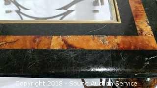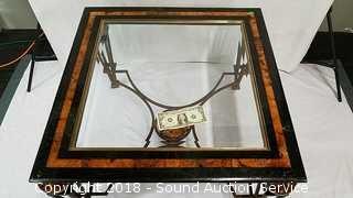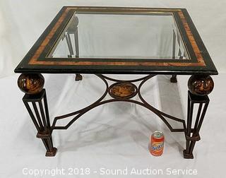Coconut shell inlaid, wrought iron, beveled glass top. By Collezione Europa USA Inc. Approx. 21" H, 30" square. Condition of items sold - The auctioneer shall not be responsible for the correct description, authenticity, genuineness of, estimated selling price of, or defect in any lot, and makes no warranty in connection therewith. No allowance will be made or sale set aside on account of any incorrectness, error in cataloging, or any imperfection not noted. No deduction will be allowed on damaged articles as all goods being exposed for public exhibition are sold “as is” and without recourse. All measurements and sizes - are approximate. Claims - No claims will be allowed after goods are removed from premises. All lots - to be sold AS IS, WHERE IS. ALL SALES FINAL, WE DO NOT ACCEPT RETURNS.
