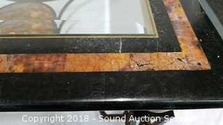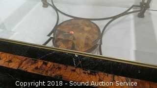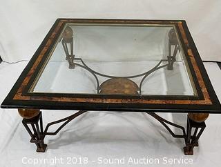 Coconut shell inlaid, wrought iron, beveled glass top. By Collezione Europa USA Inc. Approx. 16" H, 38" square. Condition of items sold - The auctioneer shall not be responsible for the correct description, authenticity, genuineness of, estimated selling price of, or defect in any lot, and makes no warranty in connection therewith. No allowance will be made or sale set aside on account of any incorrectness, error in cataloging, or any imperfection not noted. No deduction will be allowed on damaged articles as all goods being exposed for public exhibition are sold “as is” and without recourse. All measurements and sizes - are approximate. Claims - No claims will be allowed after goods are removed from premises. All lots - to be sold AS IS, WHERE IS. ALL SALES FINAL, WE DO NOT ACCEPT RETURNS.