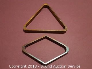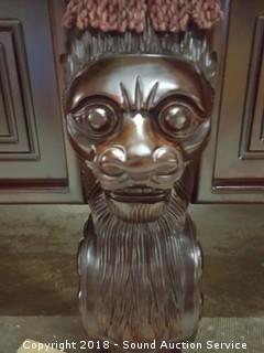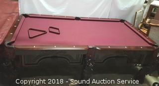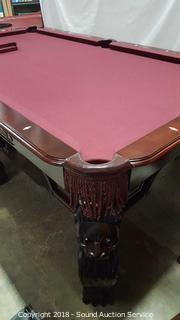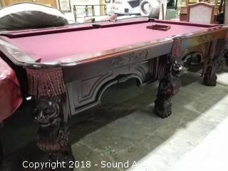 Slate Top, Ornately carved, mahogany, diamond shaped MOP inlay, leather shield pockets with fringe, carved solid wood foo dog legs, carvings on the side, red felt. Approx. 32-1/2" H, 55" x 99". Comes with 9 ball rack and standard triangle. Condition of items sold - The auctioneer shall not be responsible for the correct description, authenticity, genuineness of, estimated selling price of, or defect in any lot, and makes no warranty in connection therewith. No allowance will be made or sale set aside on account of any incorrectness, error in cataloging, or any imperfection not noted. No deduction will be allowed on damaged articles as all goods being exposed for public exhibition are sold “as is” and without recourse. All measurements and sizes - are approximate. Claims - No claims will be allowed after goods are removed from premises. All lots - to be sold AS IS, WHERE IS. ALL SALES FINAL, WE DO NOT ACCEPT RETURNS.