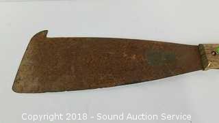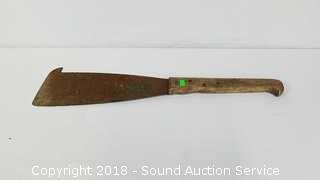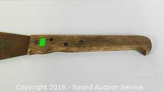 Wooden handle. Overall approx. 24" L, 13" x 4-1/2" blade. Condition of items sold - The auctioneer shall not be responsible for the correct description, authenticity, genuineness of, estimated selling price of, or defect in any lot, and makes no warranty in connection therewith. No allowance will be made or sale set aside on account of any incorrectness, error in cataloging, or any imperfection not noted. No deduction will be allowed on damaged articles as all goods being exposed for public exhibition are sold “as is” and without recourse. All measurements and sizes - are approximate. Claims - No claims will be allowed after goods are removed from premises. All lots - to be sold AS IS, WHERE IS. ALL SALES FINAL, WE DO NOT ACCEPT RETURNS.