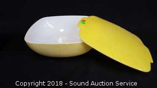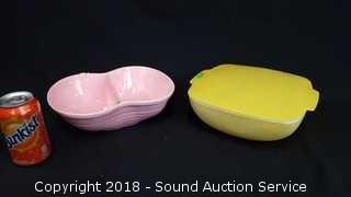 Includes: Yellow Square Pyrex Bowl w/Matching Lid, and Painted Marcrest Sectional Bowl. The auctioneer shall not be responsible for the correct description, authenticity, genuineness of, estimated selling price of, or defect in any lot, and makes no warranty in connection therewith. No allowance will be made or sale set aside on account of any incorrectness, error in cataloging, or any imperfection not noted. No deduction will be allowed on damaged articles as all goods being exposed for public exhibition are sold “as is” and without recourse. All measurements and sizes - are approximate. CLAIMS - No claims will be allowed after goods are removed from premises. All lots - to be sold AS IS, WHERE IS. ALL SALES FINAL, WE DO NOT ACCEPT RETURNS.