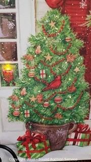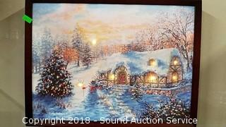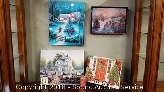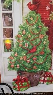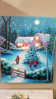 Christmas Themed. One comes with a wrought iron stand. Approx. 12" x 16" and 16" x 20". One is missing the battery cover. Batteries not included. The auctioneer shall not be responsible for the correct description, authenticity, genuineness of, estimated selling price of, or defect in any lot, and makes no warranty in connection therewith. No allowance will be made or sale set aside on account of any incorrectness, error in cataloging, or any imperfection not noted. No deduction will be allowed on damaged articles as all goods being exposed for public exhibition are sold “as is” and without recourse. All measurements and sizes - are approximate. CLAIMS - No claims will be allowed after goods are removed from premises. All lots - to be sold AS IS, WHERE IS. ALL SALES FINAL, WE DO NOT ACCEPT RETURNS.