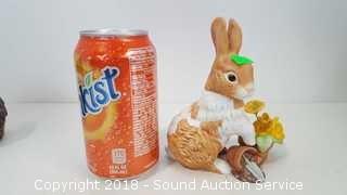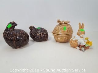 Pleasants and walnut are handmade, porcelain, signed "Thea" (Pheasants embossed Arnell's). Rabbit is #1,752/7,500. Approx. 4" to 5-1/2" H. The auctioneer shall not be responsible for the correct description, authenticity, genuineness of, estimated selling price of, or defect in any lot, and makes no warranty in connection therewith. No allowance will be made or sale set aside on account of any incorrectness, error in cataloging, or any imperfection not noted. No deduction will be allowed on damaged articles as all goods being exposed for public exhibition are sold “as is” and without recourse. All measurements and sizes - are approximate. CLAIMS - No claims will be allowed after goods are removed from premises. All lots - to be sold AS IS, WHERE IS. ALL SALES FINAL, WE DO NOT ACCEPT RETURNS.