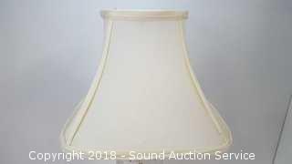 Believe it is crystal, no sure. Shade has some fraying. Approx. 24" H. The auctioneer shall not be responsible for the correct description, authenticity, genuineness of, estimated selling price of, or defect in any lot, and makes no warranty in connection therewith. No allowance will be made or sale set aside on account of any incorrectness, error in cataloging, or any imperfection not noted. No deduction will be allowed on damaged articles as all goods being exposed for public exhibition are sold “as is” and without recourse. All measurements and sizes - are approximate. CLAIMS - No claims will be allowed after goods are removed from premises. All lots - to be sold AS IS, WHERE IS. ALL SALES FINAL, WE DO NOT ACCEPT RETURNS.
