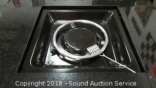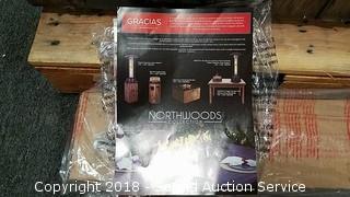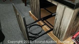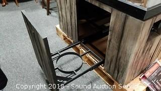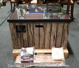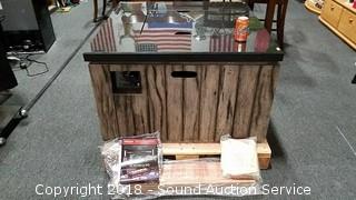 Works, has never been fully assembled. Some of the wood grain wallpaper is peeling at the bottom in spots. Comes with manual, cover, glass, touch up pen. Approx. 24" H, 40" square. The auctioneer shall not be responsible for the correct description, authenticity, genuineness of, estimated selling price of, or defect in any lot, and makes no warranty in connection therewith. No allowance will be made or sale set aside on account of any incorrectness, error in cataloging, or any imperfection not noted. No deduction will be allowed on damaged articles as all goods being exposed for public exhibition are sold “as is” and without recourse. All measurements and sizes - are approximate. CLAIMS - No claims will be allowed after goods are removed from premises. All lots - to be sold AS IS, WHERE IS. ALL SALES FINAL, WE DO NOT ACCEPT RETURNS.