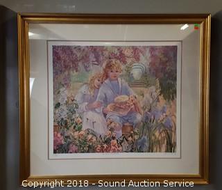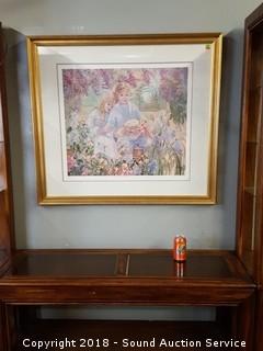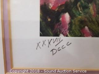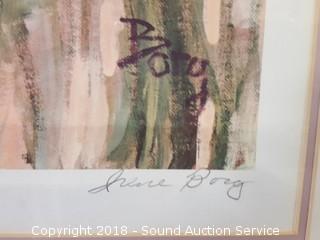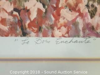 Professionally framed with glass. By artist Irene Borg. Titled "Le Bois Enchante". #37/800. Overall approx. 36" x 39-1/2". Frame fits a 37" x 32" piece of artwork. The auctioneer shall not be responsible for the correct description, authenticity, genuineness of, estimated selling price of, or defect in any lot, and makes no warranty in connection therewith. No allowance will be made or sale set aside on account of any incorrectness, error in cataloging, or any imperfection not noted. No deduction will be allowed on damaged articles as all goods being exposed for public exhibition are sold “as is” and without recourse. All measurements and sizes - are approximate. CLAIMS - No claims will be allowed after goods are removed from premises. All lots - to be sold AS IS, WHERE IS. ALL SALES FINAL, WE DO NOT ACCEPT RETURNS.