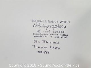Titled "Mt. Rainier Tipsoo Lake". #8/150. By Brskine Wood. Profesionally framed and matted with glass. Overall approx. 25" x 21". The auctioneer shall not be responsible for the correct description, authenticity, genuineness of, estimated selling price of, or defect in any lot, and makes no warranty in connection therewith. No allowance will be made or sale set aside on account of any incorrectness, error in cataloging, or any imperfection not noted. No deduction will be allowed on damaged articles as all goods being exposed for public exhibition are sold “as is” and without recourse. All measurements and sizes - are approximate. CLAIMS - No claims will be allowed after goods are removed from premises. All lots - to be sold AS IS, WHERE IS. ALL SALES FINAL, WE DO NOT ACCEPT RETURNS.