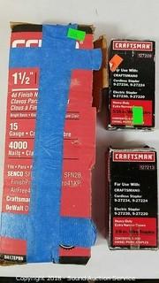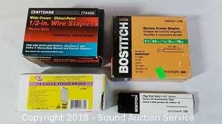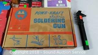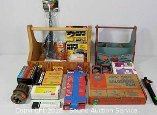 Includes: 2 wooden tool totes, soldering gun, rod holder, various brad nail strips, and staples. The auctioneer shall not be responsible for the correct description, authenticity, genuineness of, estimated selling price of, or defect in any lot, and makes no warranty in connection therewith. No allowance will be made or sale set aside on account of any incorrectness, error in cataloging, or any imperfection not noted. No deduction will be allowed on damaged articles as all goods being exposed for public exhibition are sold “as is” and without recourse. All measurements and sizes - are approximate. CLAIMS - No claims will be allowed after goods are removed from premises. All lots - to be sold AS IS, WHERE IS. ALL SALES FINAL, WE DO NOT ACCEPT RETURNS.