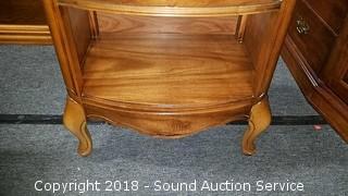 Has lower cubby. Matches tables in previous 2 lots. Approx. 27" H, 23" W, 16" D. The auctioneer shall not be responsible for the correct description, authenticity, genuineness of, estimated selling price of, or defect in any lot, and makes no warranty in connection therewith. No allowance will be made or sale set aside on account of any incorrectness, error in cataloging, or any imperfection not noted. No deduction will be allowed on damaged articles as all goods being exposed for public exhibition are sold “as is” and without recourse. All measurements and sizes - are approximate. CLAIMS - No claims will be allowed after goods are removed from premises. All lots - to be sold AS IS, WHERE IS. ALL SALES FINAL, WE DO NOT ACCEPT RETURNS.