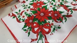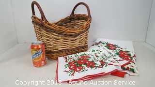 Lot #0072: Wicker Woven Basket w/Poinsettia Tablecloth Towels