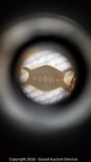 Necklace is 4 grams. Earrings are 3.5 grams. The auctioneer shall not be responsible for the correct description, authenticity, genuineness of, estimated selling price of, or defect in any lot, and makes no warranty in connection therewith. No allowance will be made or sale set aside on account of any incorrectness, error in cataloging, or any imperfection not noted. No deduction will be allowed on damaged articles as all goods being exposed for public exhibition are sold “as is” and without recourse. All measurements and sizes - are approximate. CLAIMS - No claims will be allowed after goods are removed from premises. All lots - to be sold AS IS, WHERE IS. ALL SALES FINAL, WE DO NOT ACCEPT RETURNS.