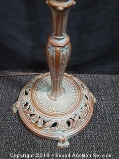 Antique finish. Has some damage on the shade. Approx. 69" H, 13" shade. The auctioneer shall not be responsible for the correct description, authenticity, genuineness of, estimated selling price of, or defect in any lot, and makes no warranty in connection therewith. No allowance will be made or sale set aside on account of any incorrectness, error in cataloging, or any imperfection not noted. No deduction will be allowed on damaged articles as all goods being exposed for public exhibition are sold “as is” and without recourse. All measurements and sizes - are approximate. CLAIMS - No claims will be allowed after goods are removed from premises. All lots - to be sold AS IS, WHERE IS. ALL SALES FINAL, WE DO NOT ACCEPT RETURNS.