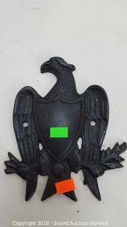 Cast iron eagle is approx. 6-1/2" x 5". The auctioneer shall not be responsible for the correct description, authenticity, genuineness of, estimated selling price of, or defect in any lot, and makes no warranty in connection therewith. No allowance will be made or sale set aside on account of any incorrectness, error in cataloging, or any imperfection not noted. No deduction will be allowed on damaged articles as all goods being exposed for public exhibition are sold “as is” and without recourse. All measurements and sizes - are approximate. CLAIMS - No claims will be allowed after goods are removed from premises. All lots - to be sold AS IS, WHERE IS. ALL SALES FINAL, WE DO NOT ACCEPT RETURNS.