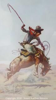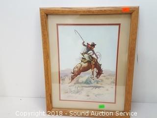 Titlted "The Bucking Bronco". Framed with glass. Print of the original done in 1904. Approx. 15" x 12". The auctioneer shall not be responsible for the correct description, authenticity, genuineness of, estimated selling price of, or defect in any lot, and makes no warranty in connection therewith. No allowance will be made or sale set aside on account of any incorrectness, error in cataloging, or any imperfection not noted. No deduction will be allowed on damaged articles as all goods being exposed for public exhibition are sold “as is” and without recourse. All measurements and sizes - are approximate. CLAIMS - No claims will be allowed after goods are removed from premises. All lots - to be sold AS IS, WHERE IS. ALL SALES FINAL, WE DO NOT ACCEPT RETURNS.