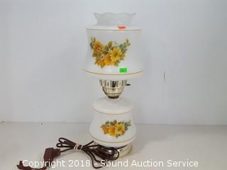 Approx. 16" H. Has a break on the piece that holds the shade. The auctioneer shall not be responsible for the correct description, authenticity, genuineness of, estimated selling price of, or defect in any lot, and makes no warranty in connection therewith. No allowance will be made or sale set aside on account of any incorrectness, error in cataloging, or any imperfection not noted. No deduction will be allowed on damaged articles as all goods being exposed for public exhibition are sold “as is” and without recourse. All measurements and sizes - are approximate. CLAIMS - No claims will be allowed after goods are removed from premises. All lots - to be sold AS IS, WHERE IS. ALL SALES FINAL, WE DO NOT ACCEPT RETURNS.
