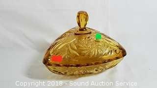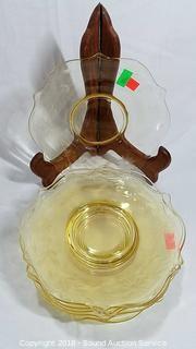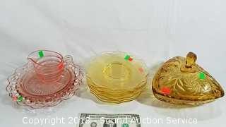 Includes: Pink creamer, 2 small plates, yellow lidded dish, and 7 etched yellow plates. The auctioneer shall not be responsible for the correct description, authenticity, genuineness of, estimated selling price of, or defect in any lot, and makes no warranty in connection therewith. No allowance will be made or sale set aside on account of any incorrectness, error in cataloging, or any imperfection not noted. No deduction will be allowed on damaged articles as all goods being exposed for public exhibition are sold “as is” and without recourse. All measurements and sizes - are approximate. CLAIMS - No claims will be allowed after goods are removed from premises. All lots - to be sold AS IS, WHERE IS. ALL SALES FINAL, WE DO NOT ACCEPT RETURNS.
