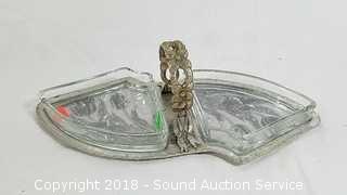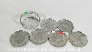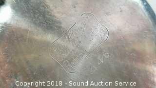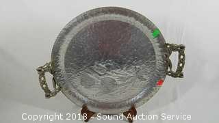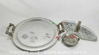 Includes: 14" handled tray (hand hammered, tulip design), condiment tray, and 6pc. coaster set. The auctioneer shall not be responsible for the correct description, authenticity, genuineness of, estimated selling price of, or defect in any lot, and makes no warranty in connection therewith. No allowance will be made or sale set aside on account of any incorrectness, error in cataloging, or any imperfection not noted. No deduction will be allowed on damaged articles as all goods being exposed for public exhibition are sold “as is” and without recourse. All measurements and sizes - are approximate. CLAIMS - No claims will be allowed after goods are removed from premises. All lots - to be sold AS IS, WHERE IS. ALL SALES FINAL, WE DO NOT ACCEPT RETURNS.