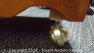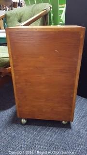 On casters. Approx. 23-1/2" H, 14" W, 9" D. The auctioneer shall not be responsible for the correct description, authenticity, genuineness of, estimated selling price of, or defect in any lot, and makes no warranty in connection therewith. No allowance will be made or sale set aside on account of any incorrectness, error in cataloging, or any imperfection not noted. No deduction will be allowed on damaged articles as all goods being exposed for public exhibition are sold “as is” and without recourse. All measurements and sizes - are approximate. CLAIMS - No claims will be allowed after goods are removed from premises. All lots - to be sold AS IS, WHERE IS. ALL SALES FINAL, WE DO NOT ACCEPT RETURNS.