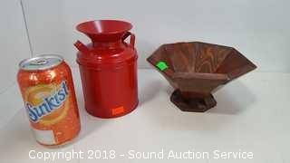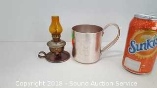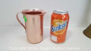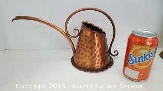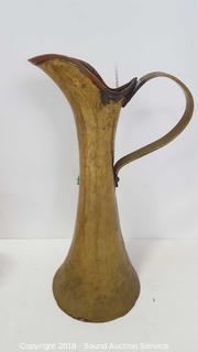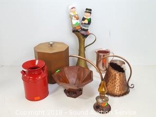 Includes: hand hammered Gregorian pitcher, Teleflora candlestick holders, milk can container, small candle sconce oil lamp, wooden box, and dish. The auctioneer shall not be responsible for the correct description, authenticity, genuineness of, estimated selling price of, or defect in any lot, and makes no warranty in connection therewith. No allowance will be made or sale set aside on account of any incorrectness, error in cataloging, or any imperfection not noted. No deduction will be allowed on damaged articles as all goods being exposed for public exhibition are sold “as is” and without recourse. All measurements and sizes - are approximate. CLAIMS - No claims will be allowed after goods are removed from premises. All lots - to be sold AS IS, WHERE IS. ALL SALES FINAL, WE DO NOT ACCEPT RETURNS.