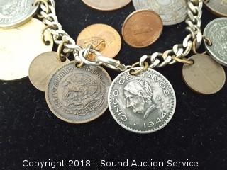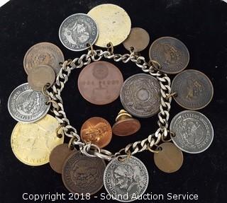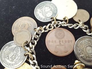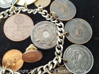 Lot #0166: Vtg. 8" Coin Charm Bracelet & Pin