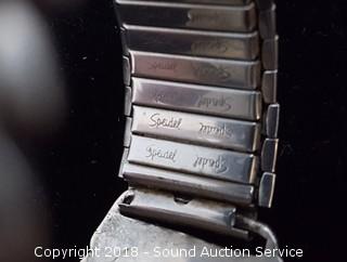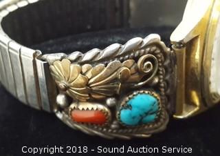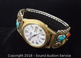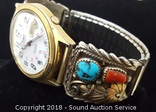 Sterling, turquoise and jasper adorned band. Needs new battery. Railroad approved. Serial V513-8159. The auctioneer shall not be responsible for the correct description, authenticity, genuineness of, estimated selling price of, or defect in any lot, and makes no warranty in connection therewith. No allowance will be made or sale set aside on account of any incorrectness, error in cataloging, or any imperfection not noted. No deduction will be allowed on damaged articles as all goods being exposed for public exhibition are sold “as is” and without recourse. All measurements and sizes - are approximate. CLAIMS - No claims will be allowed after goods are removed from premises. All lots - to be sold AS IS, WHERE IS. ALL SALES FINAL, WE DO NOT ACCEPT RETURNS.
