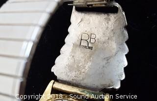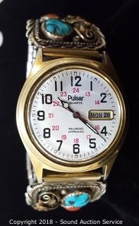 Lot #0160: Vtg. Navajo R. Begay Sterling & Turquoise Band w/ Pulsar Watch