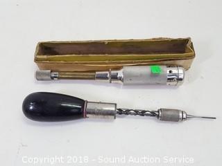 Includes: Goodell-Pratt 1915 Push Drill w/Bits in the handle (Works Great), and Yankee No. 33H Push Drill w/Bit. The auctioneer shall not be responsible for the correct description, authenticity, genuineness of, estimated selling price of, or defect in any lot, and makes no warranty in connection therewith. No allowance will be made or sale set aside on account of any incorrectness, error in cataloging, or any imperfection not noted. No deduction will be allowed on damaged articles as all goods being exposed for public exhibition are sold “as is” and without recourse. All measurements and sizes - are approximate. CLAIMS - No claims will be allowed after goods are removed from premises. All lots - to be sold AS IS, WHERE IS. ALL SALES FINAL, WE DO NOT ACCEPT RETURNS.